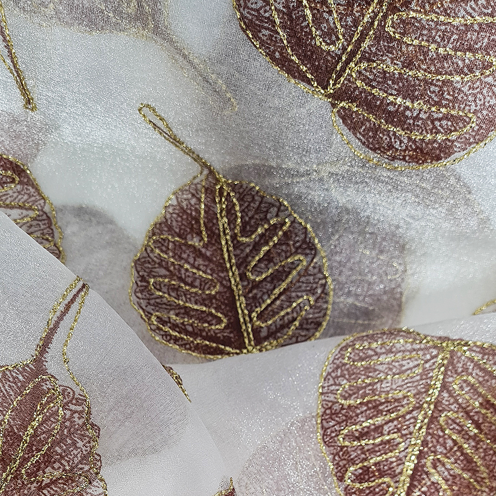 Sheer shimmery fabric with brown falling leaves, edged with gold thread. A brilliant backdrop cloth great for photography and stage productions, plus many other applications. Sold by the linear metre.