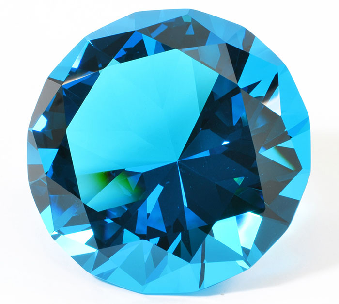 A stunning replica diamond in a vibrant, aquamarine colour. Made from high quality crystal cut glass, this gem would make a fantastic addition to many different displays, shop window and jewellery displays for example. The gem is highly reflective and refracts the light wonderfully, showing different shades and colours in each facet. The fake diamond comes in a satin lined box, making it a great gift too. Aquamarine gems are often used to celebrate 19th wedding anniversaries, as well as being one of the March birthstones.