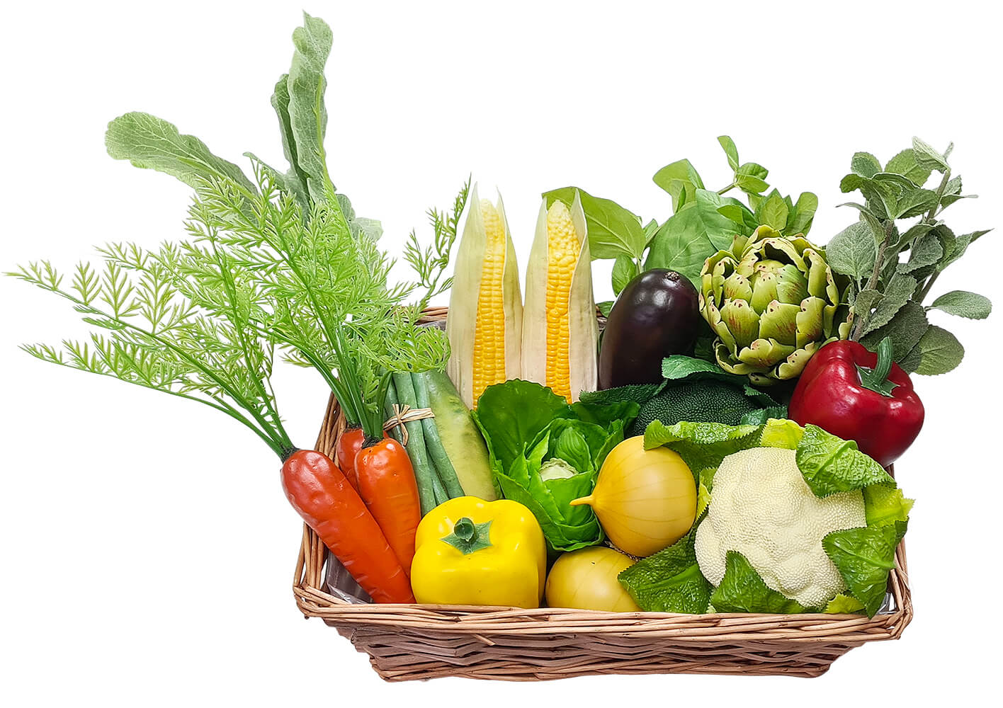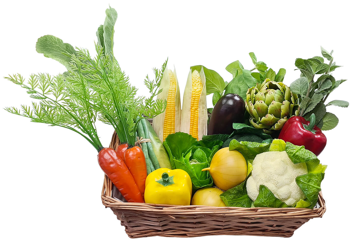 A large basket bursting with a variety of replica vegetables originating from all over the world, great for creating instant and diverse food displays. Set consists of 3 carrots, 1 broccoli, 1 cauliflower, 1 cabbage, 6 green beans, 2 cobs of corn, 2 onion, 2 peppers, 1 aubergine, 1 artichoke, 1 mooli, 1 mint spring and 1 basil sprig. Brilliantly detail and great value for money! This selection of fake vegetables is also available to buy as a pack, without the basket.
