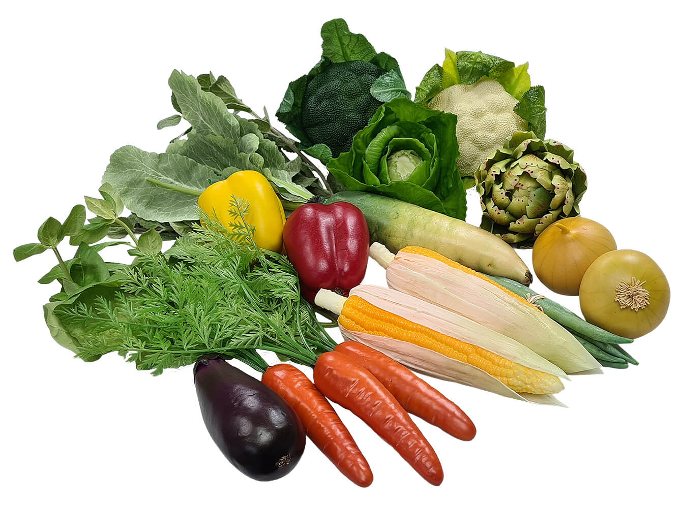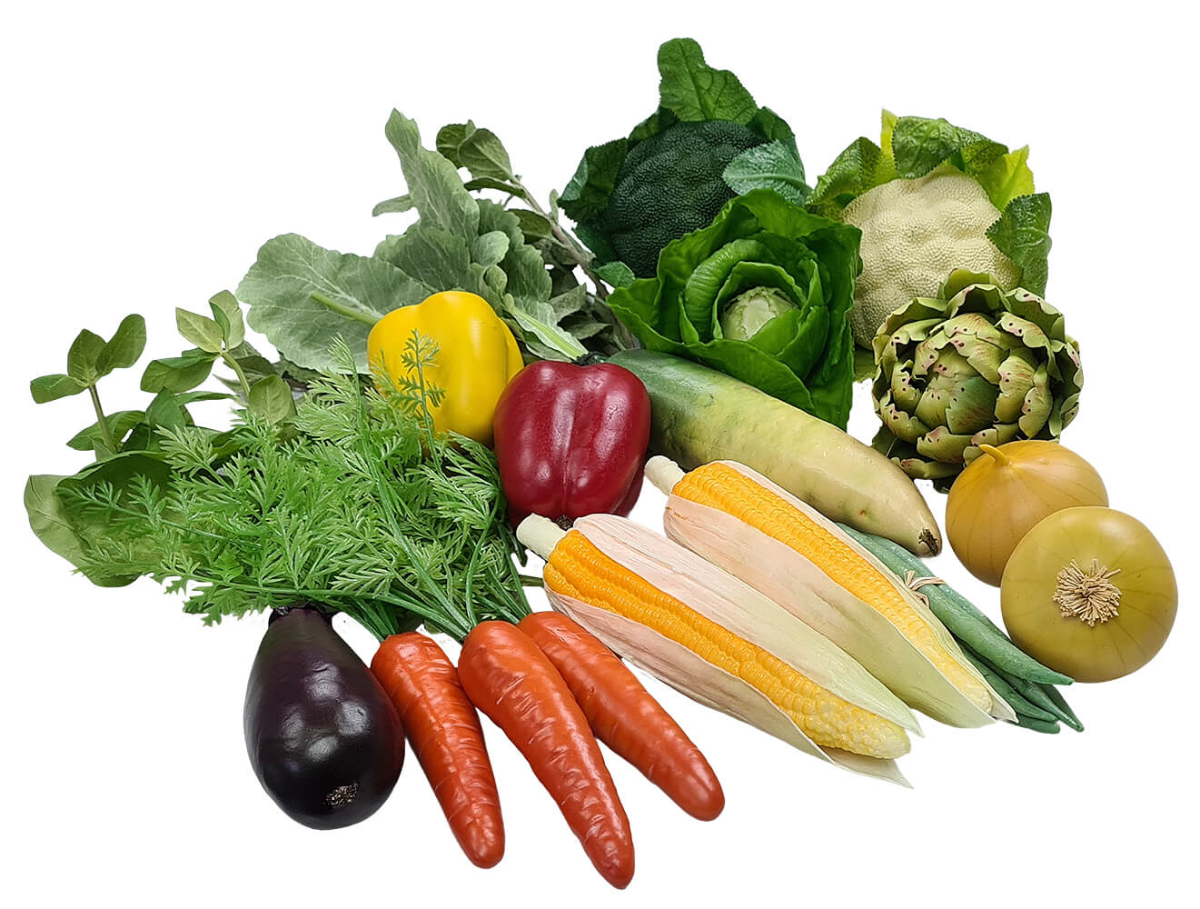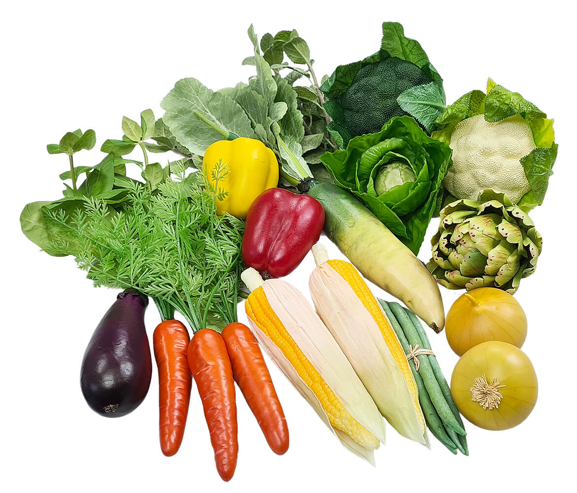 Great for creating instant and diverse food displays, this selection of fake vegetables is fantastically realistic and great value for money. It contains a colourful mix of replica vegetables including: 3 carrots, 1 broccoli, 1 cauliflower, 1 cabbage, 6 green beans, 2 cobs of corn, 2 onions, 2 peppers, 1 aubergine, 1 artichoke, 1 mooli, 1 mint spring and 1 basil sprig. The vegetables measure between 11 and 31cm in size, and are also available to buy in a set that includes a basket.