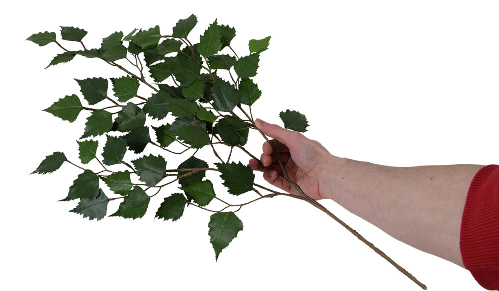 This very realistic looking fake birch branch has many applications, from window displays to theatre sets and exhibition halls. There is a slight variation of colour to the leaves, as you would see in real life, which adds to the appeal of this artificial birch branch. The branch is wired throughout, making it very flexible. The individual parts of the branch can be flexed to the side, as well as bringing them forwards to add some depth to your display, as you can from the side-angled picture. The branch is fire retardant, which is often a requirement when creating displays in exhibitions and public places.