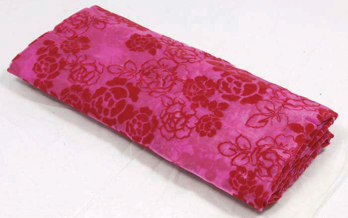 A pre-cut piece of pink organza fabric with a red floral print. Each piece measures 150 x 250cm and is supplied in a neat bundle. This decorative fabric is great for all sorts of display work, such as a table cover.