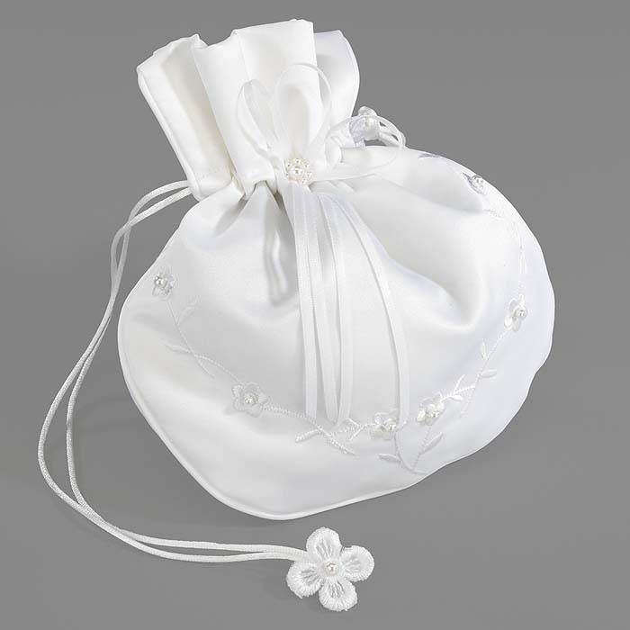 Lovely pull-string wedding bag, made from embroidered satin and finished with pearly beading and ribbons. It would be perfect for the little bridesmaids to hold, or use it as a display piece. 20 x 20cm.